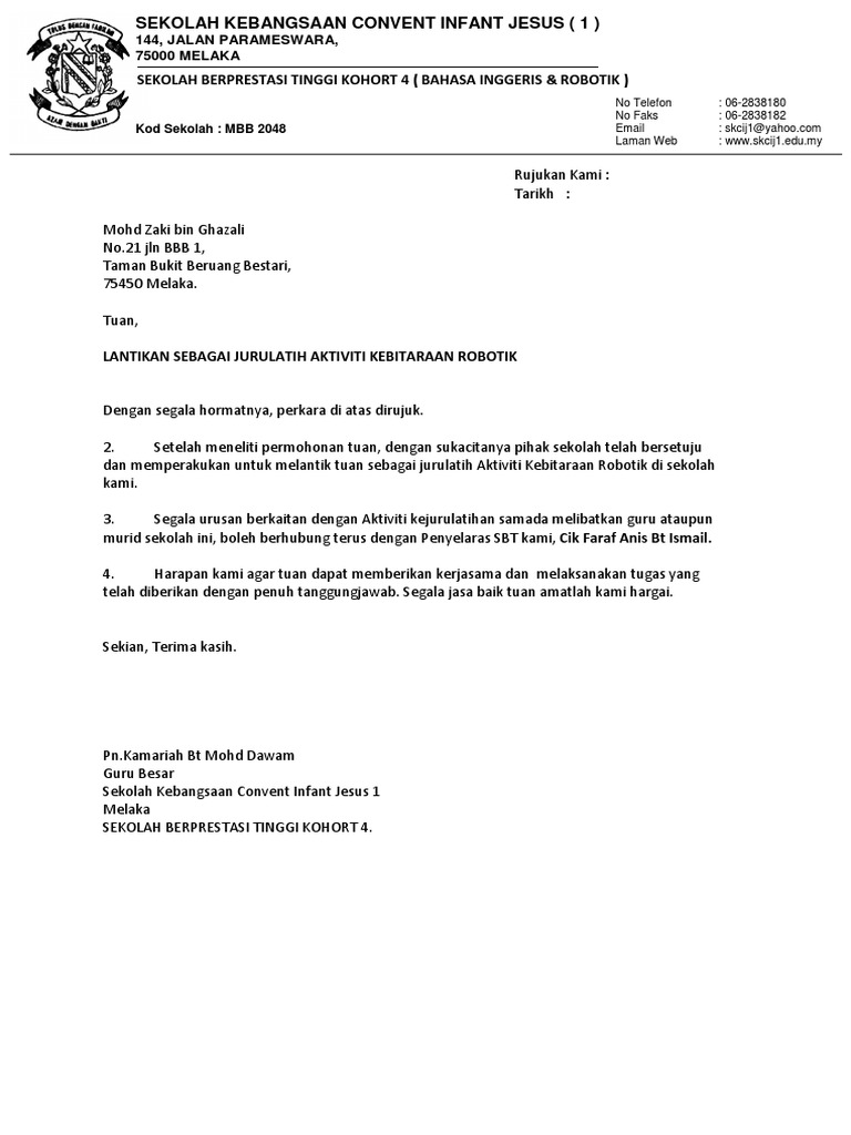 Yuran makan asrama rm1.00 sehari x 250 hari rm 250.00. Contoh surat lantikan kepada syarikat penerbitan majalah. Lantikan pertama puan nurul pada 7 jun 1999 sebagai pembantu teknik ukur, gred j5. 2 januari 2014 kepada cik siti tuan/puan/cik, pelantikan sebagai pentaksir sekolah tahun 2014 pentaksiran berasaskan sekolah mata pelajaran matematik tingkatan satu dengan hormatnya perkara di atas dirujuk. Surat perlantikan ini telah mengikut format yang betul. Here are a number of highest rated surat lantikan pp pictures on internet.