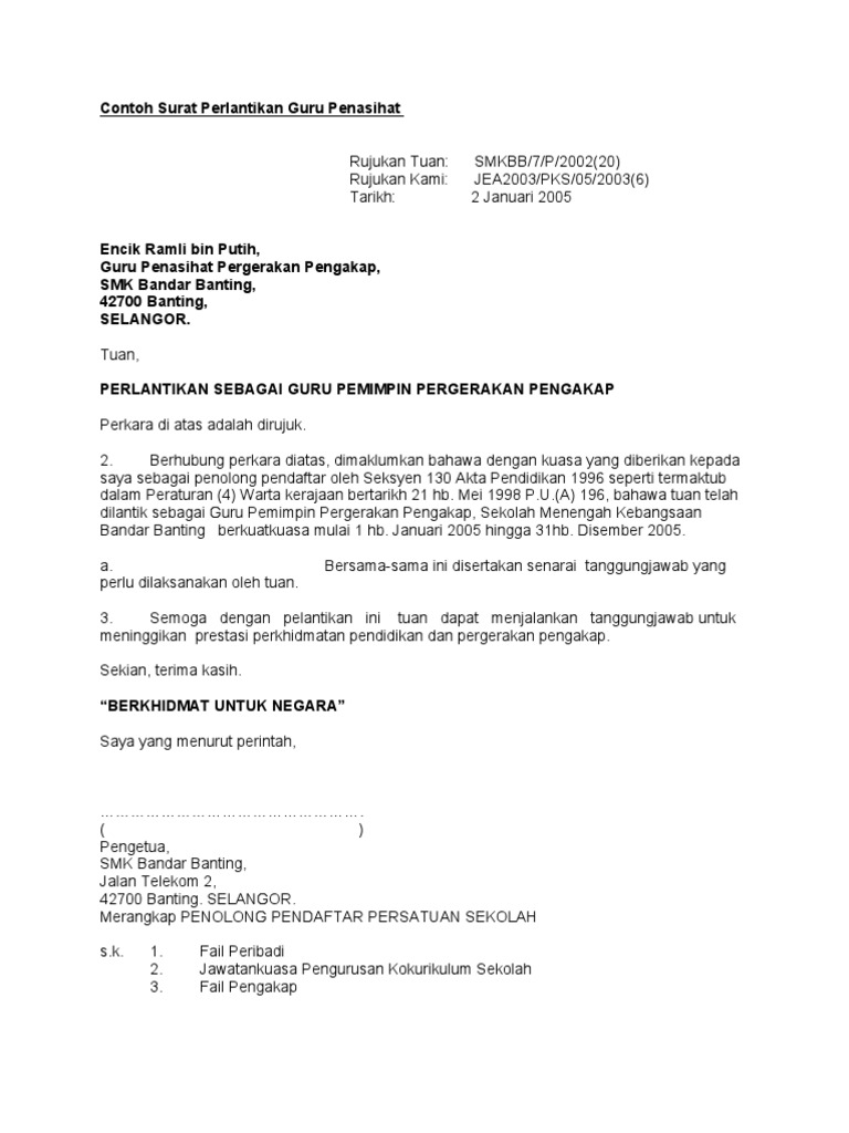 Isi sebab pertukaran setiausaha, contoh : 15 kew pa 15 surat lantikan ahli lembaga pemeriksa. Sjk(t) jalan tajul ,jalan tajul, 81900 kota tinggi,. Sertakan salinan minit mesyuarat agong surau jawatan nama & no.k/p alamat no.tel pengerusi timbalan pengerusi setiausaha bendahari jawatan nama & no.k/p alamat no.tel We acknowledge this nice of surat lantikan pengerusi graphic could possibly be the most trending subject later than we ration it in google pro or facebook. Penerimaan tuan/puan di atas perlantikan ini saya dahului dengan ucapan terima kasih.